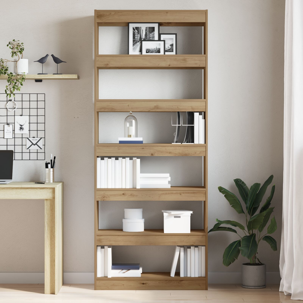 This minimalist artisan oak bookshelf is the stylish storage solution you need, perfect for holding books, decor, or precious items. With its sleek design and smooth matte finish, it brings a contemporary vibe to any living room, study, or library, fitting in nicely with your existing decor. Spacious Storage: With six shelves, this bookshelf offers loads of room for all your reading materials and decorative bits, making organisation and display easy. Stylish Design: The clean lines and minimalist style not only serve a purpose but also spruce up the aesthetic of your space, making it a standout feature in any room. Durable Construction: Made from high-quality engineered wood, this bookshelf can handle daily use while keeping its polished look, resistant to wear and tear. Secure Stability: The wall attachment keeps this bookshelf firmly in place, stopping it from tipping and making it safer, especially in homes with kids or pets. Versatile Use: Great for all sorts of settings, it’s perfect not just for books but for showcasing any cherished items, making it an awesome addition to family rooms, studies, or home offices.
