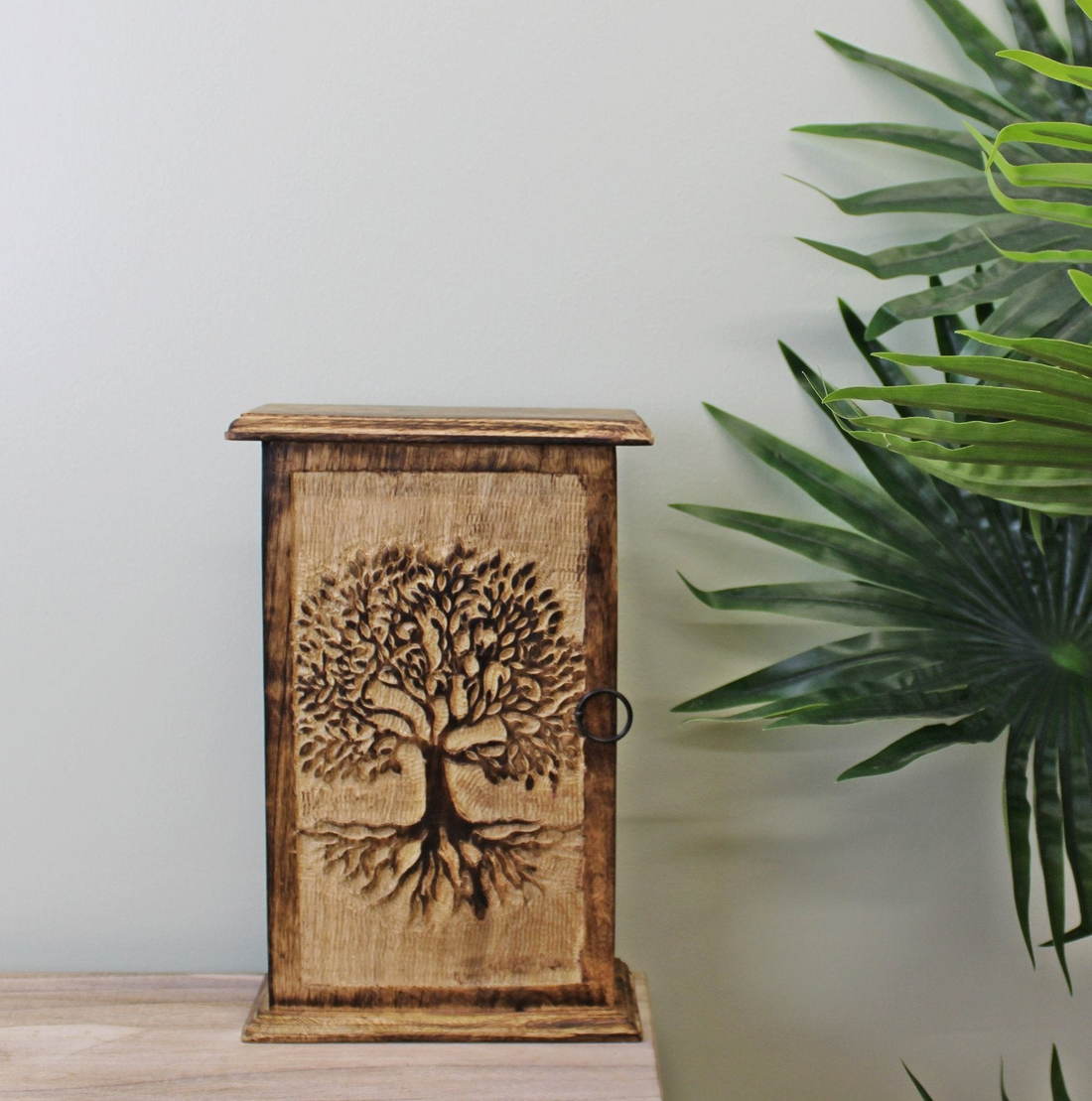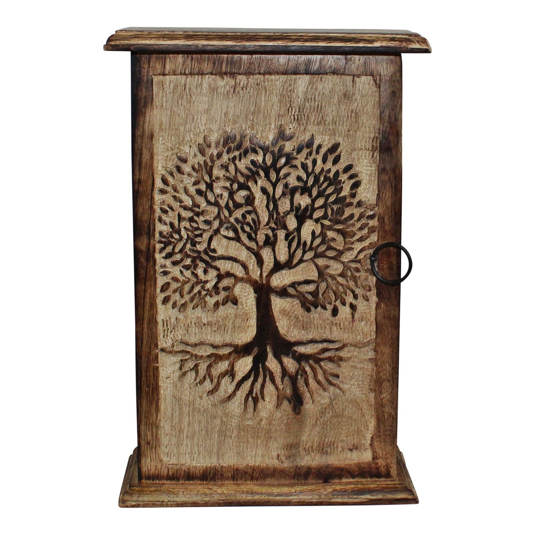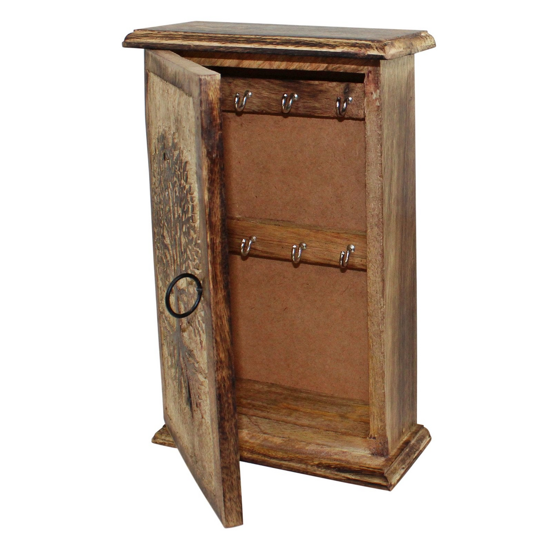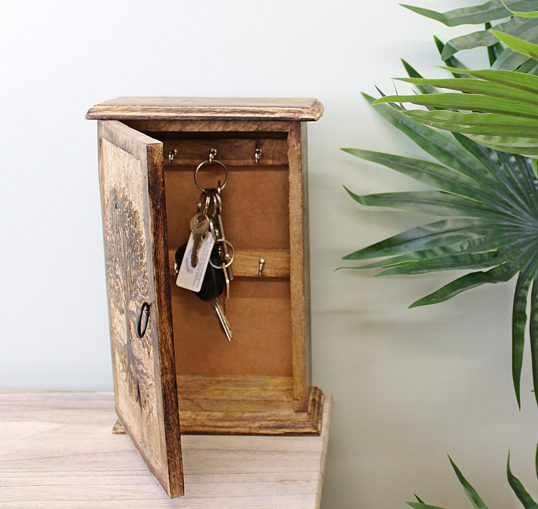 Another product in our popular tree of life range this key box has a hand carved front and inside features 6 hooks to store your keys. Can be wall hung or free standing. The key box is made of 100% mango wood and features 2 brackets on the rear for wall hanging. Measurements: 8 x 28 x 18cm SKU: TL0035