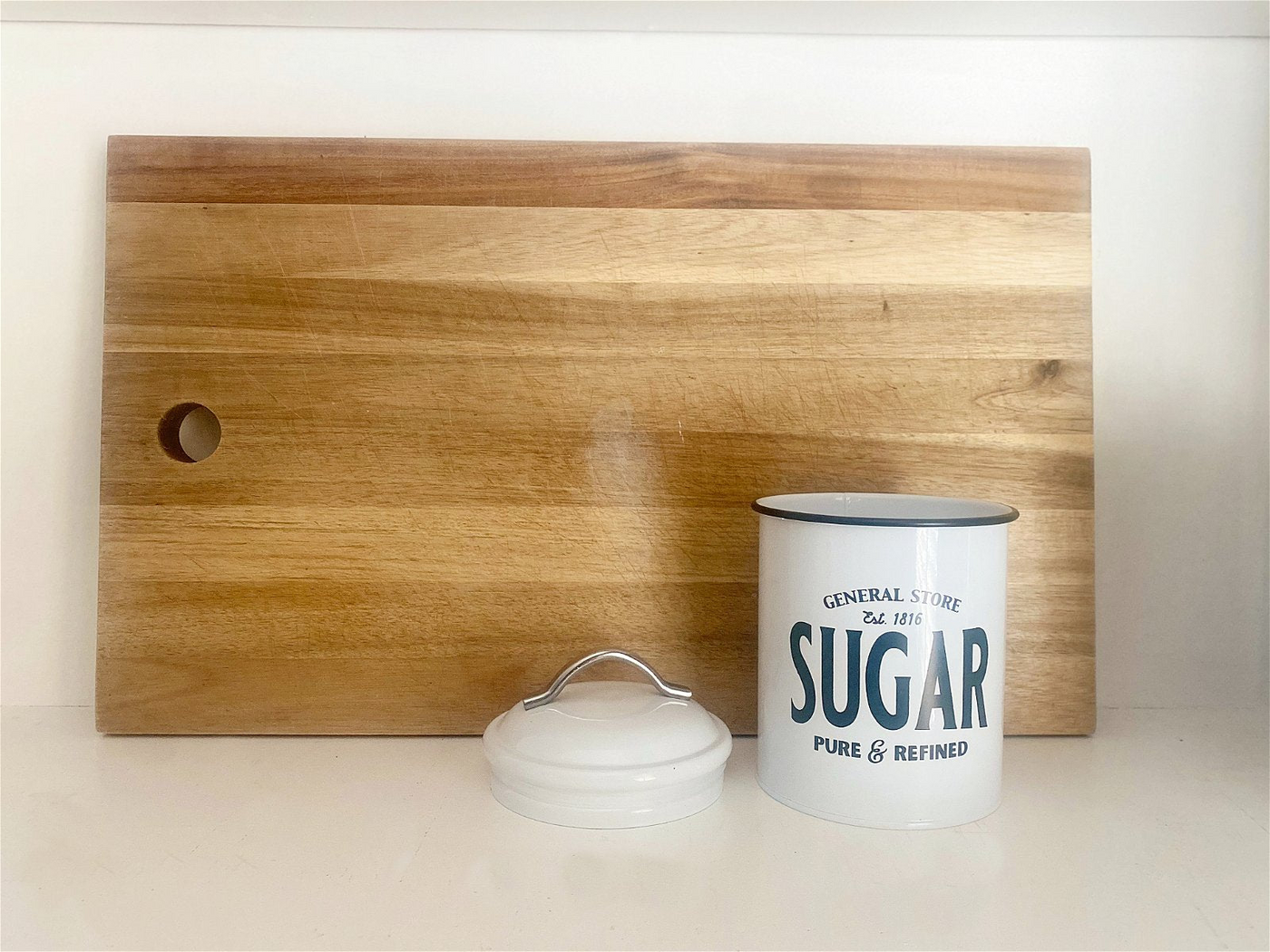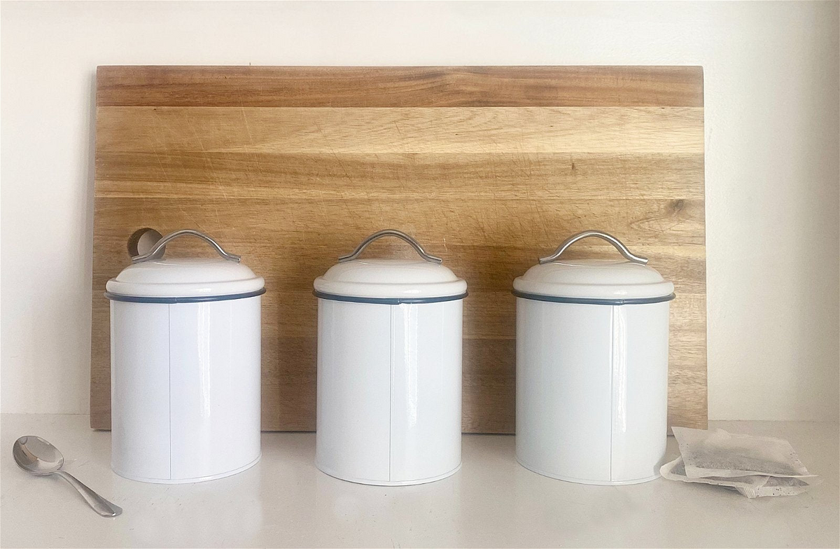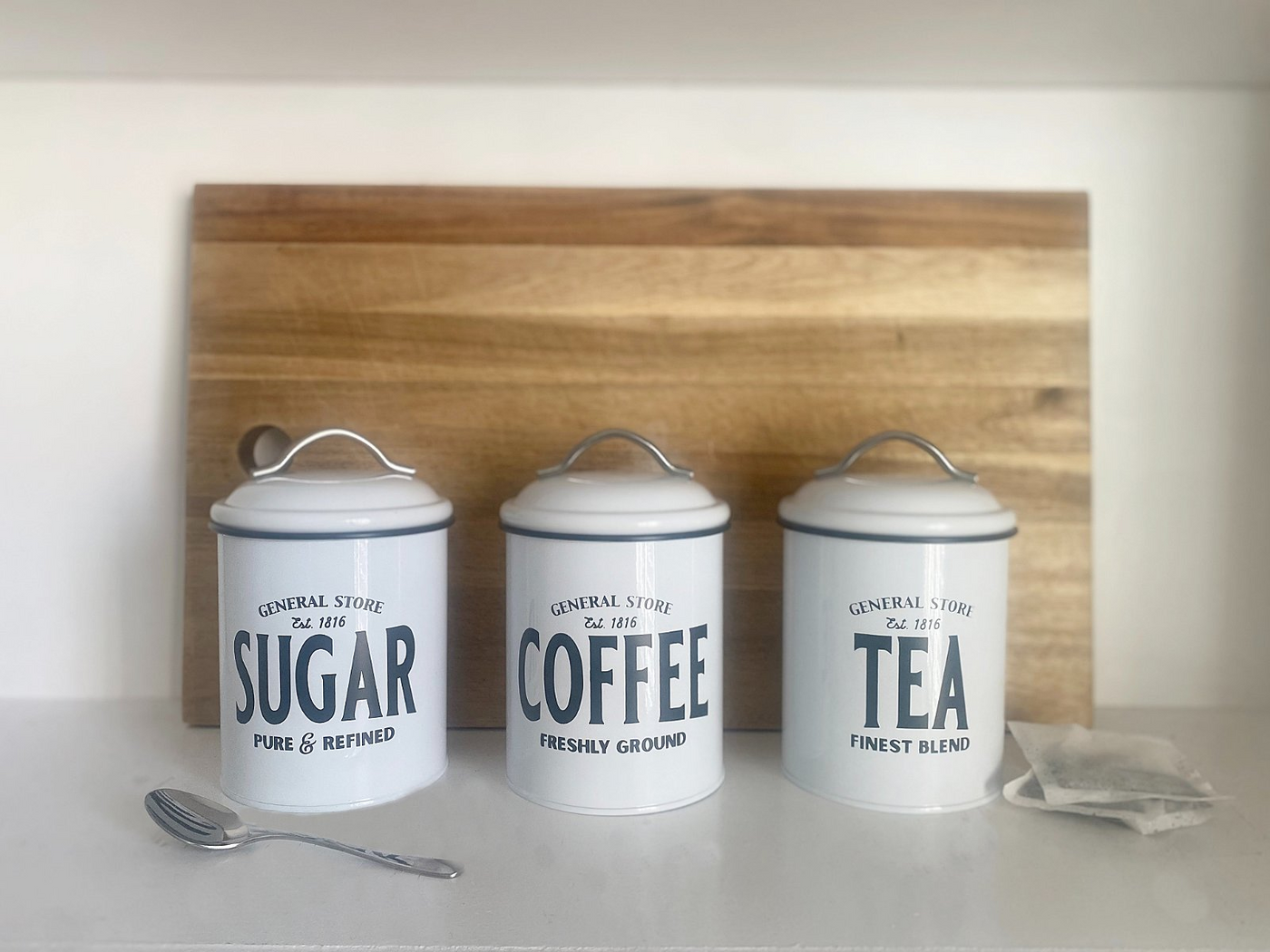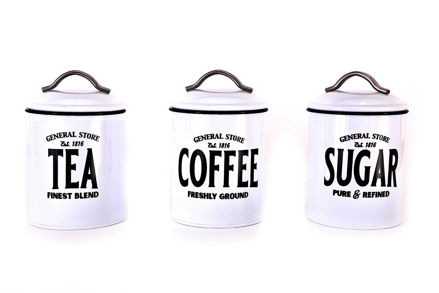 A charming trio of white metal tea, coffee and sugar canisters. Each canister has the black General Store logo on the front, with a short quote applicable to each canister. This set of three canisters adds character and practicability to any kitchen decor. TEA FINSEST BLEND'. 'COFFEE FRESHLY GROUND'. 'SUGAR PURE & REFINED'. A part of the General Store collection. Measurements: D11.5 x H17 x W11.5cm